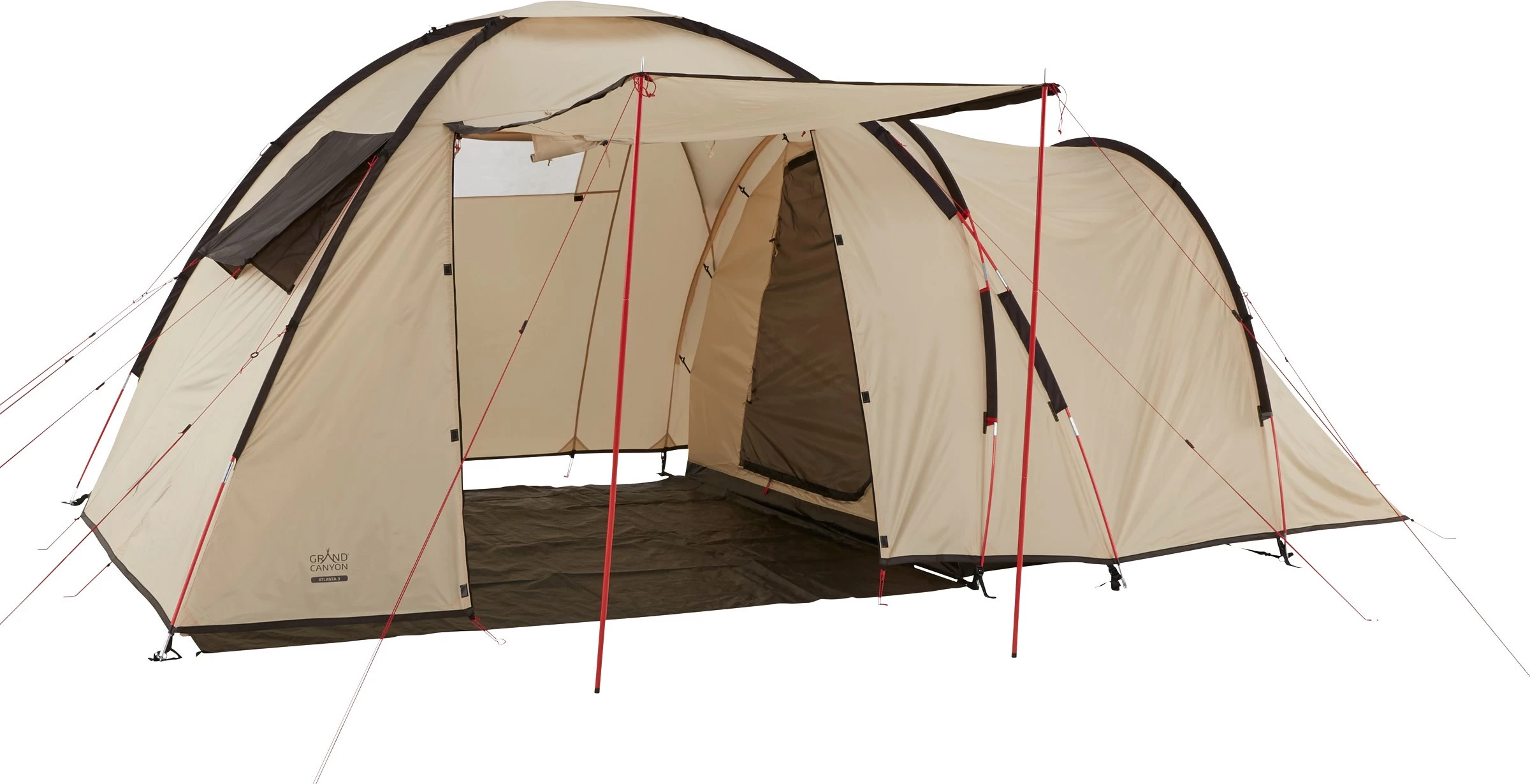 Atlanta 3 Tent fra Grand Canyon er således velegnet til sommercamping eller cykel- og kanoture. Eller som nævnt hjemme i haven til de overnattende gæster, for den sags skyld. Konstruktionen er ganske klassisk for et næsten selvstående familietelt telt til 3-4 personer, dvs. to bærende diagonalstænger til det store opholdsrum med fuld ståhøjde og to ekstra stangbuer til sovekabinen. Den store indgangsdør kan slås op og med de medfølgende stænger bruges som et ekstra overdækket areal. Dette giver ekstra gode skyggemuligheder og – sammen med ventilationsåbningerne i oversejlet – samtidig mulighed for masser af ventilation i teltet, så kondensdannelsen minimeres.