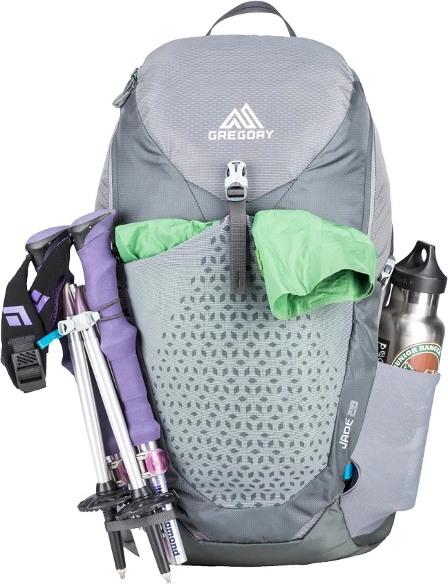 Gregory Jade 28 S/M Women er udstyret med en rummelig stretch-lomme på hver side og en stor stiklomme på fronten til fx regnjakken, klatreselen eller det våde håndklæde. Sidelommerne er store nok til at sluge hver deres 1 liters drikkeflaske, hvis man da ikke lige anvender et drikkesystem, som rygsækken selvfølgelig også er forberedt til. Derudover kan der på fronten af sækken monteres trekkingstave, isøkse eller skovl ved hjælp af de smarte, integrerede anordninger og rygsækkens eventuelle overskudsvolumen komprimeres effektivt ved hjælp af de to remme på hver side og en under låget, som tilsammen desuden sikrer, at vægten kommer ordentligt ind til ryggen.