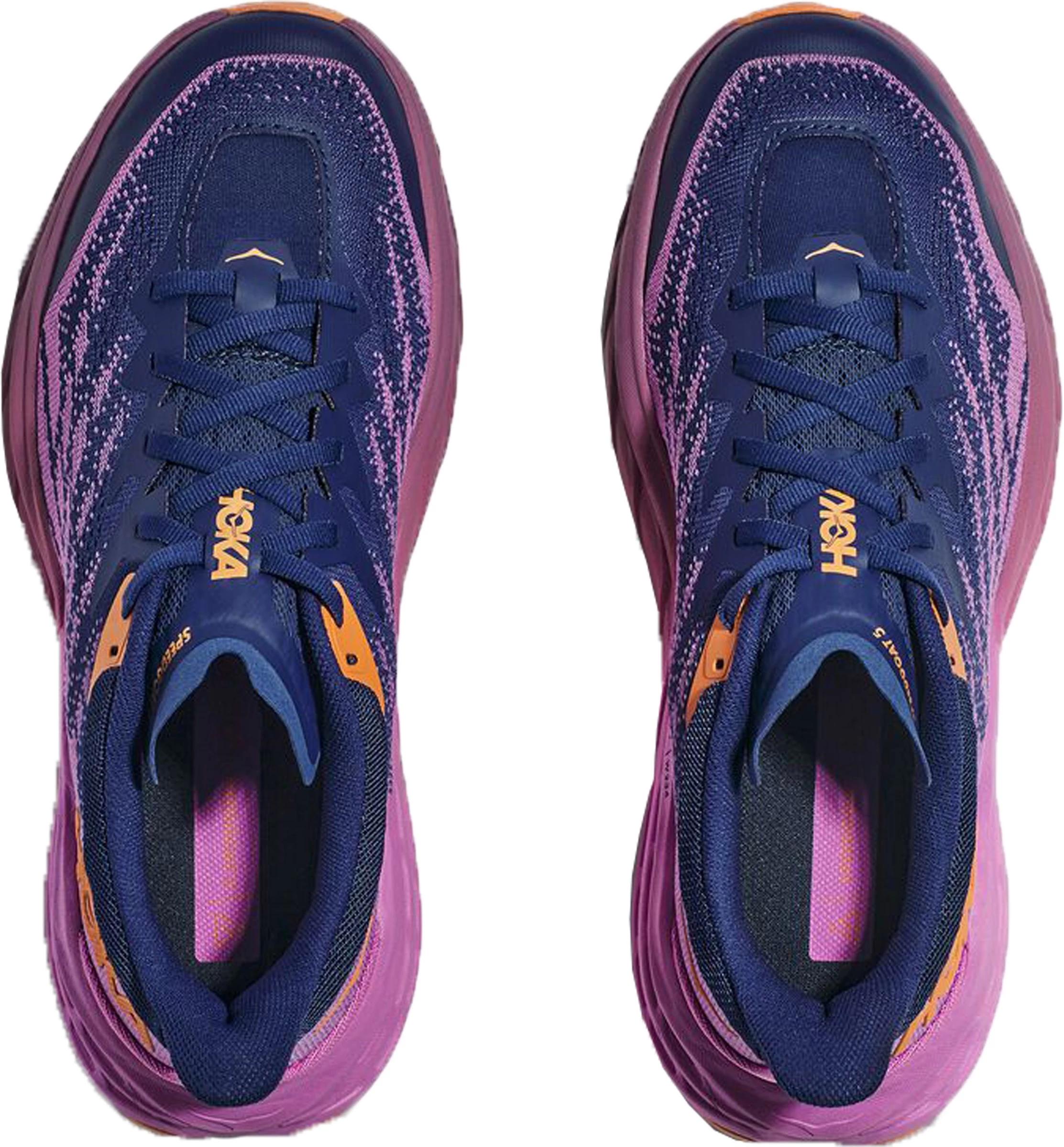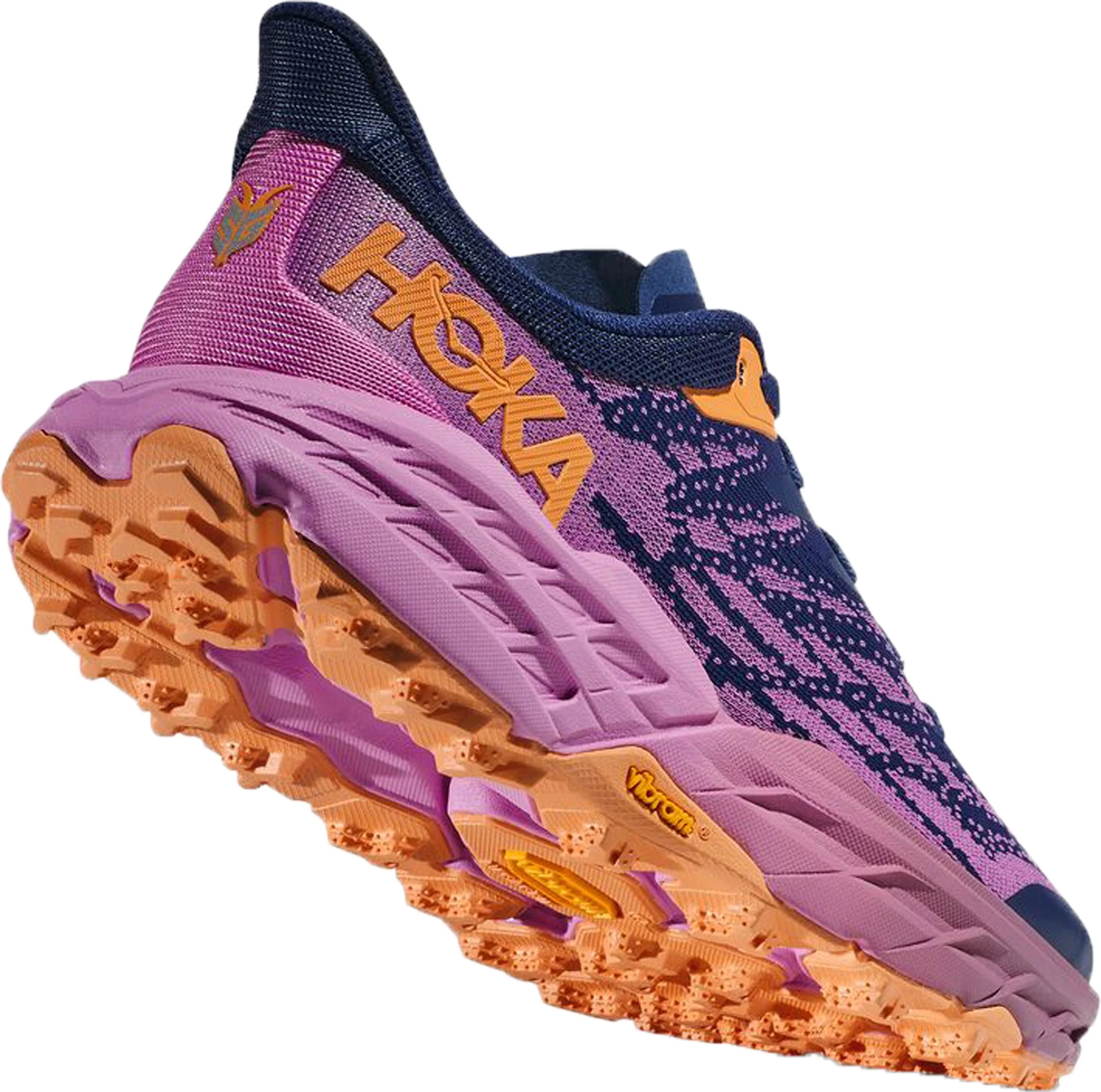 Med andre ord: Speedgoat 5 Women er en sko i ægte Hoka-stil! Den imødekommer på fornemste vis alle de innovative løsninger, som de mest krævende løbere har anmodet om. Konstruktionen af Speedgoat 5 Women er en helt ny måde at tænke terrænsko på – reglerne er omskrevet og en ny reference er født!