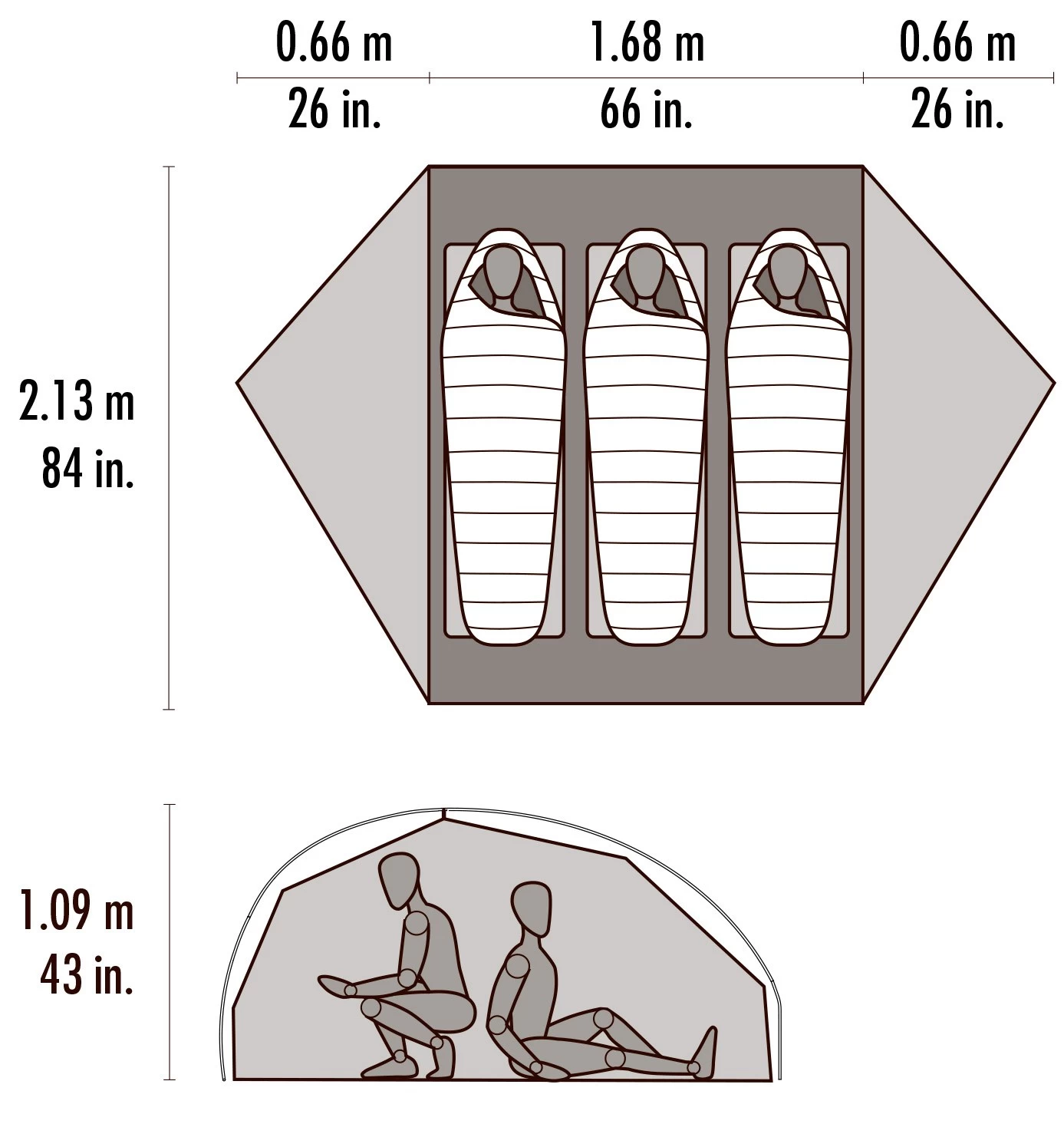 Trods den uhørt lave vægt er der ganske god plads til tre personer i det semi-selvstående FreeLite™ 3 Ultralight Tent. Inderteltet byder nemlig på en liggelængde på 213 cm, en bredde på 168 cm og en reel siddehøjde i inderteltet på op mod 109 cm, hvilket levner ganske fin plads til tre personer. Da teltet er helt symmetrisk omkring en midterakse i teltets længderetning, er FreeLite™ 3 Ultralight Tent udstyret med en meget rummelig apsis foran hver sideindgang i hele teltets længde, som er op til hele 66 cm. dyb, så der er plads til både de overnattendes rygsække, fodtøj og en gang madlavning i dårligt vejr.
