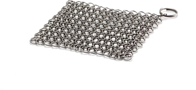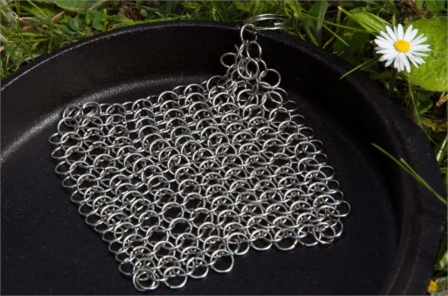 Med denne Chain Mail Cleaner, fremstillet af robust og rustfrit stål, er det bare slut med gamle madrester, der har brændt sig ubehjælpsomt fast i bålpanden eller gryden af smede- eller støbejern! Og det sker uden at ødelægge den værdifulde patina, for de indbyrdes forbundet ringe fjerner skånsomt men effektivt madresterne, uden at skrabe metallets overflade unødigt.