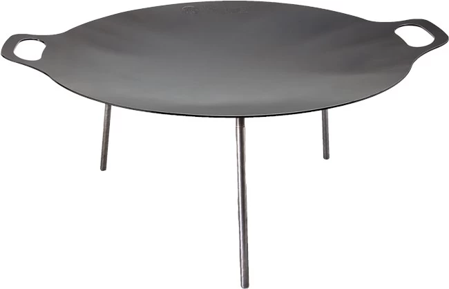 Panden har en diameter på 56 cm. og er udstyret med praktisk bæregreb i hver side. Længden på de tre ben er 23 cm, og de kan selvfølgelig skrues af, så panden fylder mindst muligt under transport.
