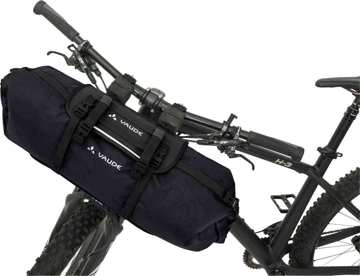 De fleksible kompressionsstropper holder indholdet godt fikseret, mens du kører, og du kan også fastgøre mere gear eller endda et telt ved hjælp af de to pakkeremme på toppen af tasken. Den særlige rammekonstruktionen er let at fastgøre på dit styr, og monteringsanordningen kan justeres i bredden, så den kan tilpasses det enkelte styr. Den praktiske afstandsholder sikrer, at du altid har plads nok til bremser og gearskifte.