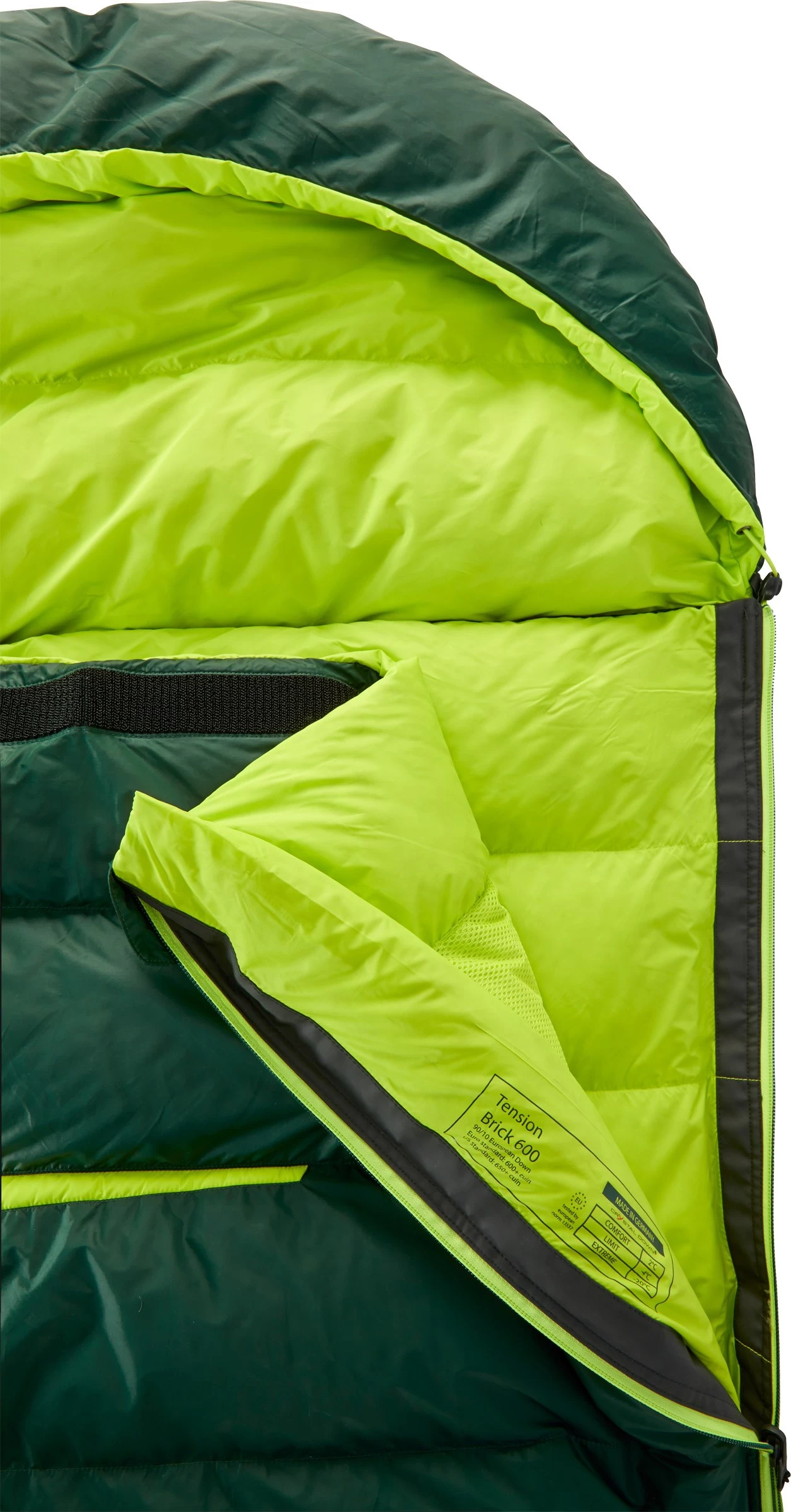 Både yder- og inderpose er fremstillet af det lette SoftCell™, som er et blødt, lækkert og meget slidstærkt nylontekstil, som dels føles yderst komfortabelt og dels sørger for god videretransport af overskudsvarme kroppens fugtafgivelse, samtidig med, at de vind- og vandresistente egenskaber er i orden. Tension Brick 600 Large er som nævnt fyldt med det lækreste Crystal Down™, som i denne model udgør omtrent 600 gram af totalvægten.
